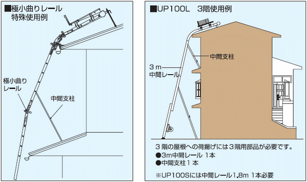 狭小地や道路に面しての現場でレールの足元を後方に設置できない場合、屋根勾配が急勾配の場合、標準の曲りレール角度が合わない場合に極小曲りレールと軒先支柱を合わせてご使用頂ければ軒先付近で安全に荷取りが可能です。