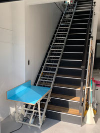 建物内外の階段搬入は、作業負担が大きく事故リスクも高まります。 階段リフトを設置することで、重量物の安全な上下搬送を実現します。