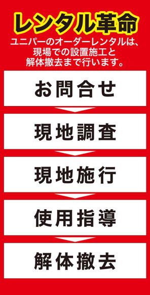 ユニパーのオーダーレンタルは、安全に使用していただくために現場での設置施工と解体撤去まで行っています。